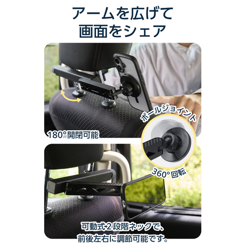 ●後部座席での動画視聴に便利!車のシートのヘッドレストポールに取り付けられる、スマホホルダーです。ホルダー部は360度回転でき、アームは左右に角度調整可能。見やすい角度で快適にスマートフォンの操作や動画を楽しめます。