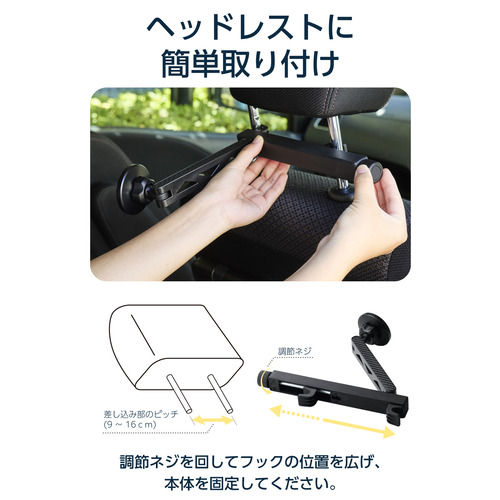 ●車のヘッドレストポール幅が13〜18mm、ヘッドレストポール内側間90〜160mmに対応。ネジを回すだけで簡単に取り付けることができます。
