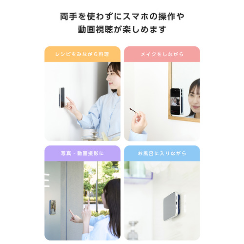 ●壁や鏡、窓ガラスなどの平らな面にシリコン吸盤で簡単に吸着可能。スマートフォンを自由な向きで固定できます。