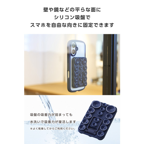 ●壁や鏡、窓ガラスなどの平らな面にシリコン吸盤で簡単に吸着可能。スマートフォンを自由な向きで固定できます。