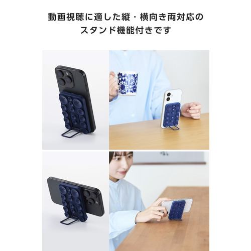 ●日常の“ながらスマホ”をより便利に!壁や鏡、窓ガラスなどの平らな面に、タコの吸盤のようにピタッと吸着する“TakoPita”スマホパッドです。MagSafe非対応のスマートフォンやケースにも対応し、両手を使わずに画面操作や動画視聴が可能。縦横どちらの向きにも使えるスタンド付きです。