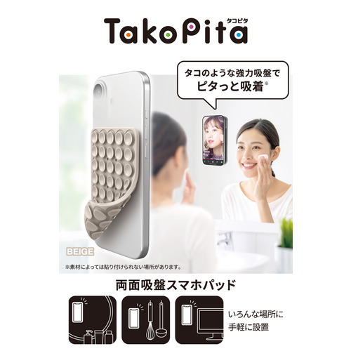 エレコム P-TKPTSUC01BG スマホホルダー 両面吸盤 全機種対応 コンパクト TakoPita ベージュ