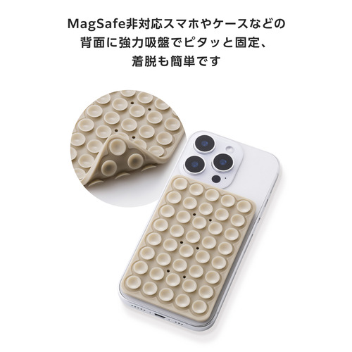 ●MagSafe非対応のスマートフォンやケースにも対応し、背面を強力吸盤でピタッと固定。取り外しも簡単です。