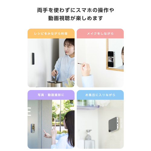 ●壁や鏡、窓ガラスなどの平らな面にシリコン吸盤で簡単に吸着可能。スマートフォンを自由な向きで固定できます。