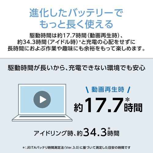 2 Days / 4 Years AIバッテリーを採用。実駆動時間は約17.7時間。大容量バッテリーに加え、かしこく節電したりバッテリーをいたわる充電で卒業後も見据えて“ながく”使えます。