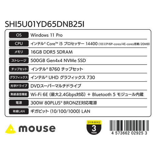 マウスコンピューター デスクトップパソコン SHI5U01YD65DNB25I[Core i5 | 16GB | 500GB | Windows 11 Pro | ブラック]