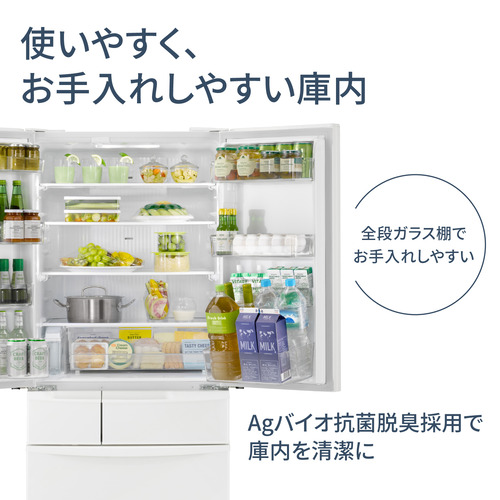 その他の特長:・トップユニット方式 ・奥まで見えるフルオープン ・ローウエストライン ・AIエコナビ(おやすみ・かしこく) ・庫外湿度センサー ・Agバイオ抗菌脱臭