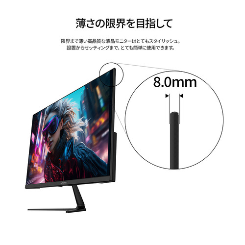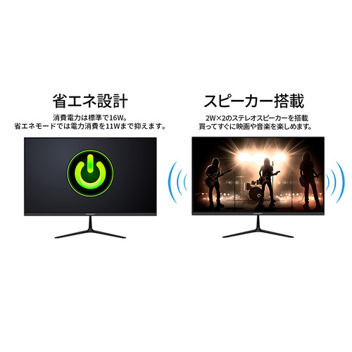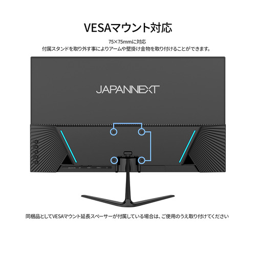 75x75mmのVESAマウントに対応、別売のモニターアームやモニタースタンドなどへの取り付けが可能です。2Wx2のスピーカーを搭載します。本製品には、2年間のメーカー保証が付きます。