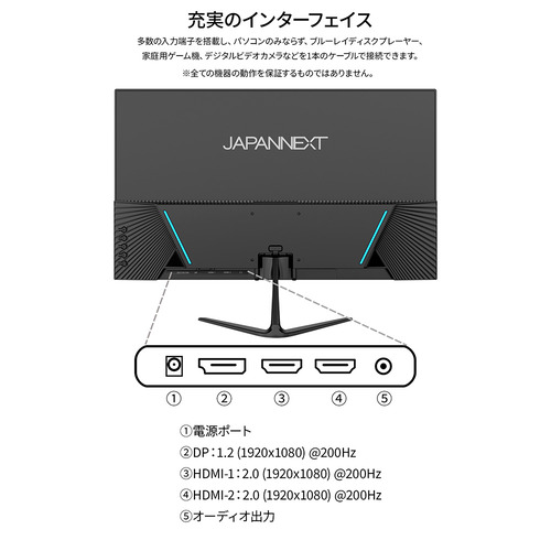 インターフェイスはHDMI 2.0 x2 (200Hz)、DisplayPort 1.2 x1 (200Hz)を装備、ゲーム機やパソコンだけでなく、様々な機器との接続が可能です。