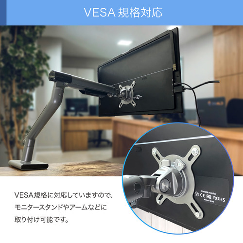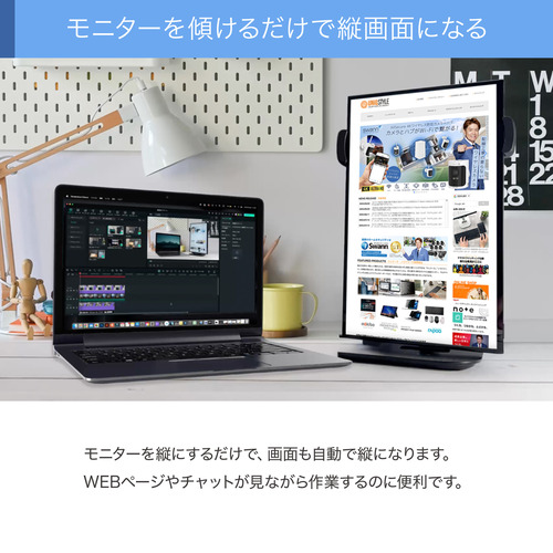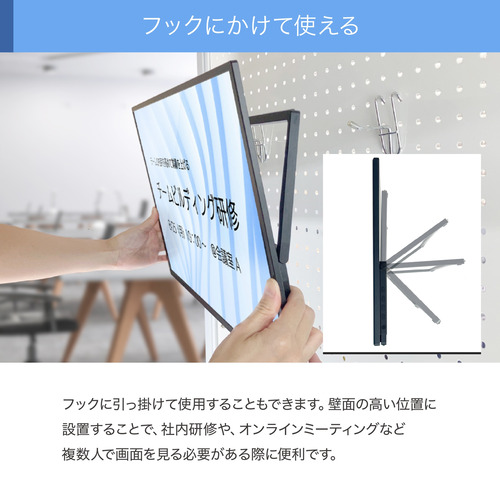 背面のU字スタンドバーにより、自立と180度の角度調整が可能。バーをハンドルのように手で持ち短時間の移動や、フックに掛けて壁面設置ができ、使用場所の自由度が広がります。