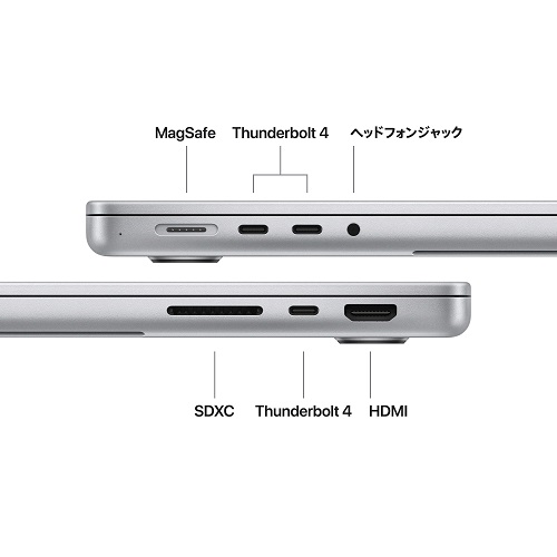 このMacBook Proは、3つのThunderbolt 4ポート、MagSafe 3充電ポート、SDXCカードスロット、HDMIポート、ヘッドフォンジャックを搭載。最大2台の外部ディスプレイも接続できます。