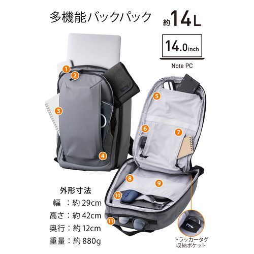 ポケット(気室内):前気室:オープンポケット×3・ペン挿し×2、メイン気室:パソコン用オープンポケット(起毛)×1・タブレット用オープンポケット×1・オープンポケット×2・ファスナーポケット(ストレッチメッシュ)×2・AirTag用オープンポケット×1・ペン挿し×2
