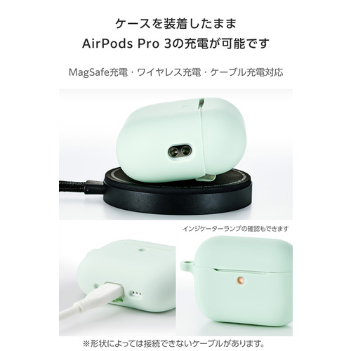 エレコム AVA-AP07SCGN AirPods Pro 3 ケース MagSafe対応 シリコン 耐衝撃 滑りにくい カラビナ付 落下防止 グリーン