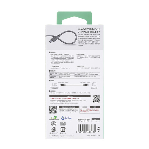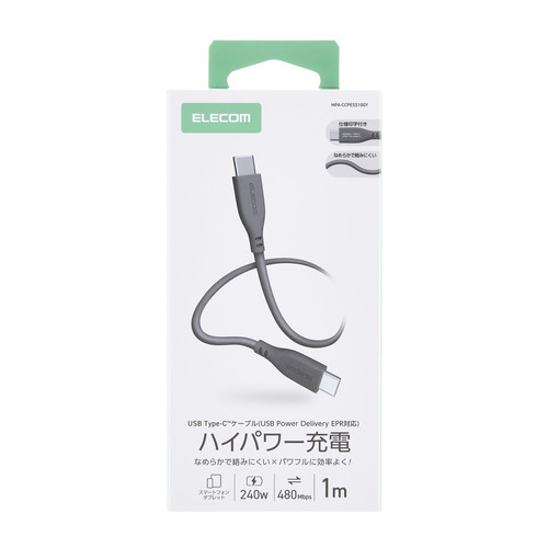 エレコム MPA-CCPESS10GY 240W PD EPR USB Type-C ケーブル 1m やわらかシリコン eMarker 480Mbps グレー