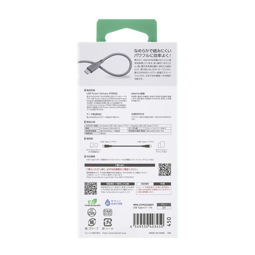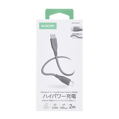 エレコム MPA-CCPESS20GY 240W PD EPR USB Type-C ケーブル 2m やわらかシリコン eMarker 480Mbps グレー