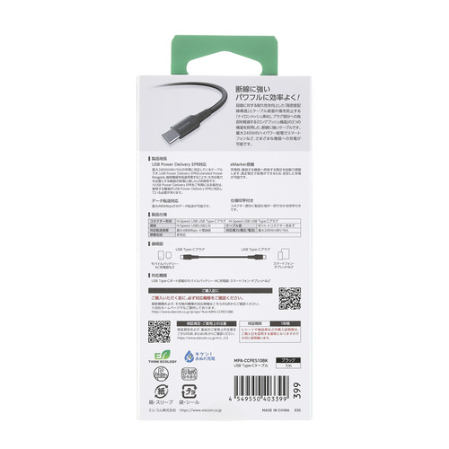 エレコム MPA-CCPES10BK 240W PD EPR USB Type-C ケーブル 1m 高耐久ナイロン 断線に強い eMarker 480Mbps ブラック