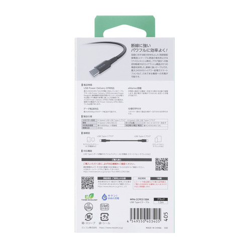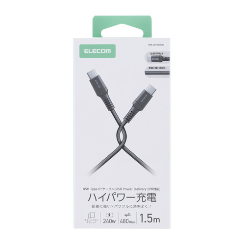 エレコム MPA-CCPES15BK 240W PD EPR USB Type-C ケーブル 1.5m 高耐久ナイロン 断線に強い eMarker 480Mbps ブラック