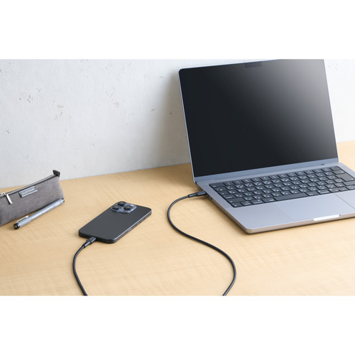 ●ナイロンメッシュ素材、高密度配線、ロングブッシュを採用した、断線に強い高耐久仕様のUSB Type-C(TM)ケーブルです。最大240Wのハイパワー充電で、スマートフォンやノートパソコンなどさまざまな機器への充電と、最大480Mbpsでのデータ転送が可能です。