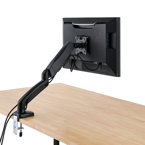 ●モニターとアームにそれぞれブラケットを取り付け、挿し込むだけで設置完了。重いモニターを抱えてネジ止めする必要がなく、簡単に着脱できます。