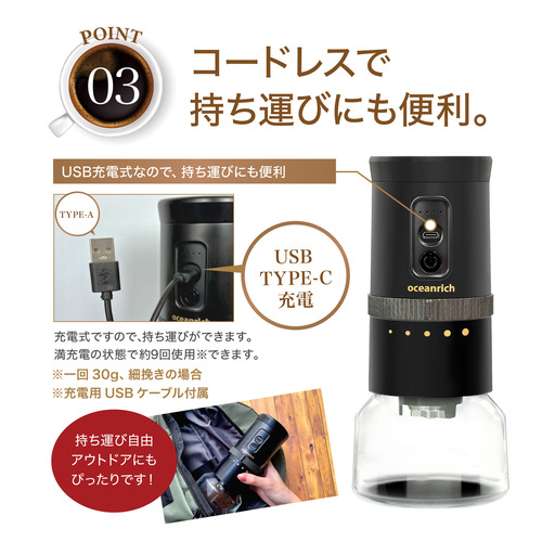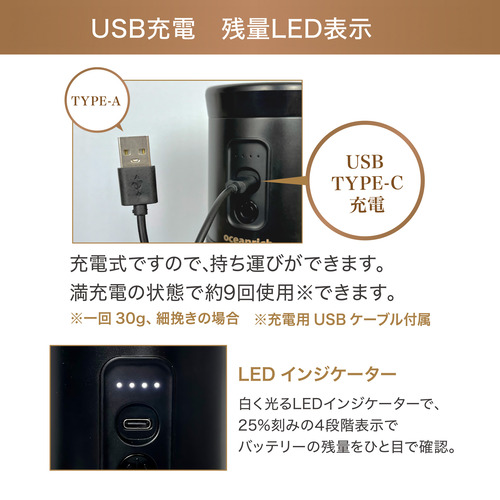充電式ですので、持ち運びができます。満充電の状態で約9回使用※できます。一回30g、細挽きの場合、充電用USB ケーブル付属。