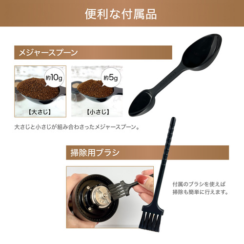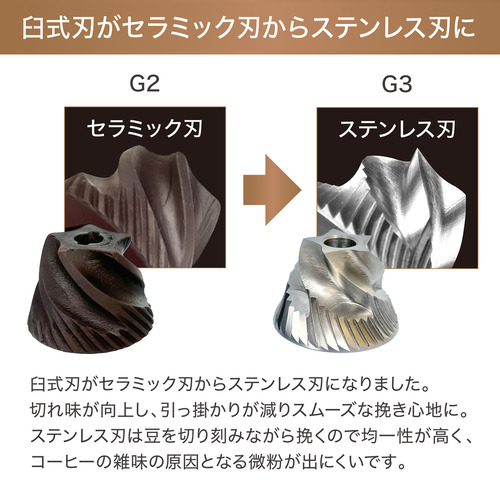 臼式刃がセラミック刃からステンレス刃になりました。切れ味が向上し、引っ掛かりが減りスムーズな挽き心地に。ステンレス刃は豆を切り刻みながら挽くので均一性が高く、コーヒーの雑味の原因となる微粉が出にくいです。