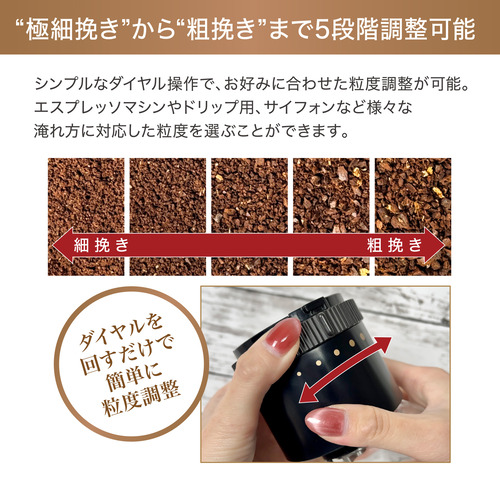 ●極細挽きから粗挽きまで5段階調整可能