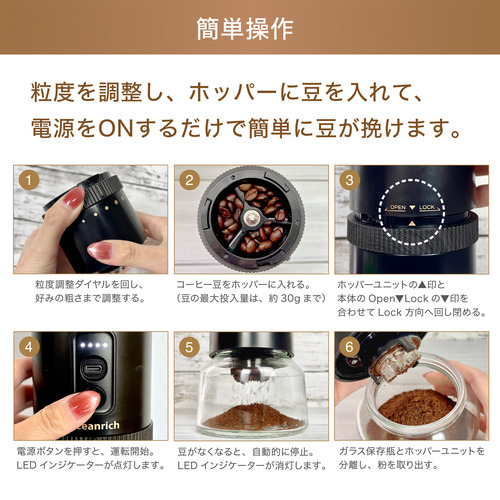 コーヒー豆をホッパーに入れ、(豆の最大投入量は約30gです。)スイッチを押すだけの簡単操作。コーヒー一杯分が約34秒で挽き終わります。挽き終わって約10 秒後に電源が自動でOFF!