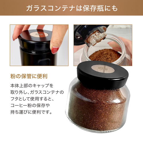 本体上部のキャップを取り外し、ガラスコンテナのフタとして使用すると、コーヒー粉の保存や持ち運びに便利です。