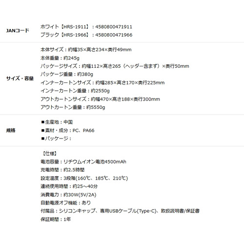 ヒロコーポレーション HRS-1911 コードレスアイロン 3段階温度調節可 バッテリーが外せる ホワイト