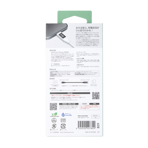 エレコム MPA-CCW10WH 240W PD EPR USB Type-C ケーブル 1m 電力ディスプレイ付き やわらかシリコン ホワイト