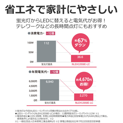 東芝LEDシーリングでトップクラスの省エネモデル。省エネ性能☆☆☆☆☆ 広めのお部屋におすすめです。