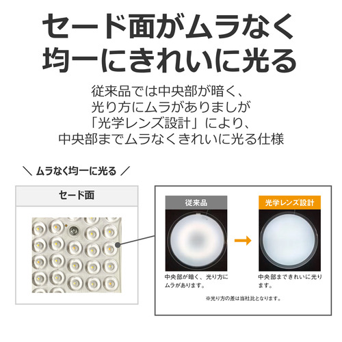 発光部のレンズ設計でセード面がムラなく均一できれいに光る「光学レンズ設計」を採用。中央部までムラなくきれいに光ります。