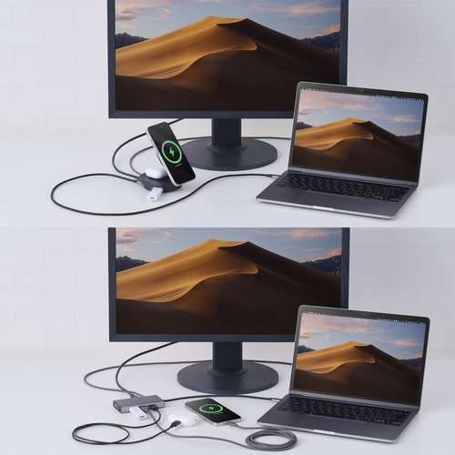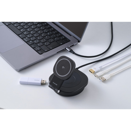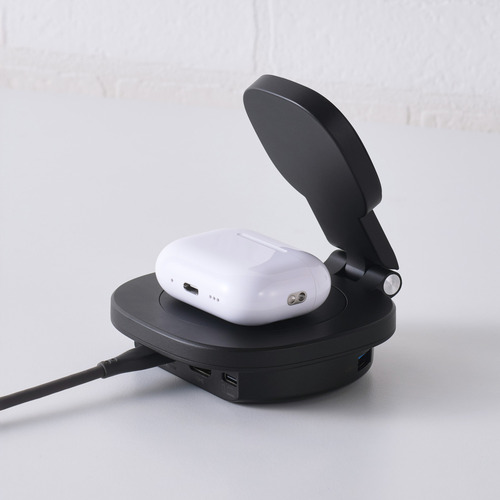 ●Qi2対応のワイヤレス充電スタンドを備えた4in1ドッキングステーションです。スマートフォンやAirPodsのワイヤレス充電に加え、ノートパソコンや周辺機器の接続も1台にまとめることができます。また折りたたんでコンパクトに収納できます。