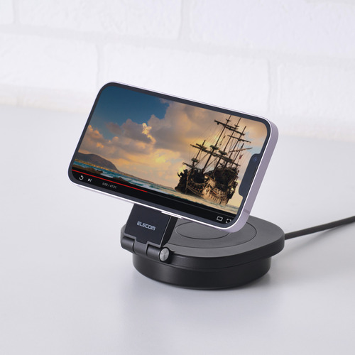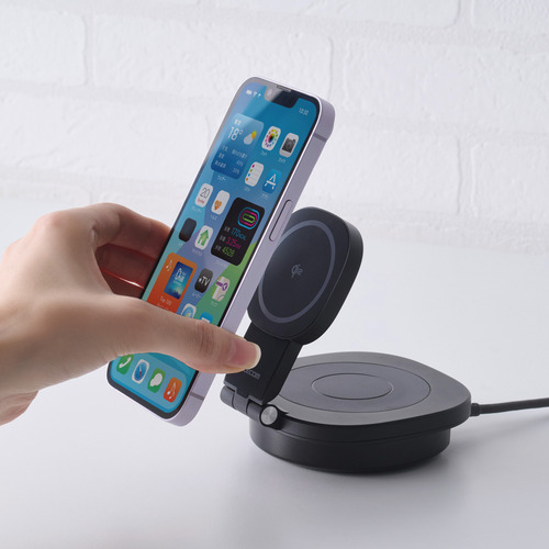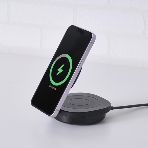 ●Qi2対応スマートフォンは、スタンドにマグネットで固定するだけで、最大出力15Wのワイヤレス充電ができます。ケーブルの抜き挿しが不要なため、席を立つ際もスムーズに利用できます。