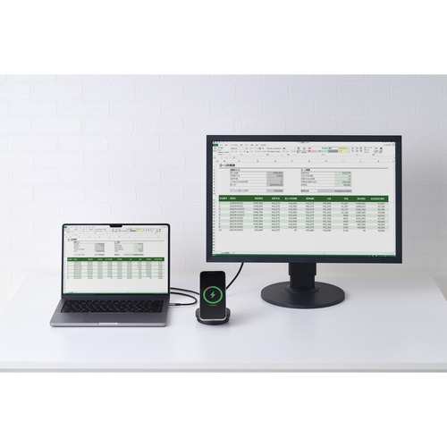 ●スマートフォンやAirPodsの充電、パソコンの充電、周辺機器の接続をこの1台に集約。Qi2対応ワイヤレス充電スタンドを備えた4in1ドッキングステーションです。デスク周りの機器をまとめることで、ワークスペースが整理され作業効率が向上します。安定したスタンド設計でスマートフォンをしっかり固定し、作業中でも見やすい最適な角度を保ちます。また折りたたんでコンパクトに収納できます。