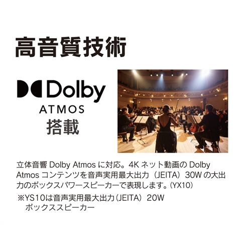 音声:■スピーカー フルレンジ2個 ■実用最大出力(JEITA) 30W(15W+15W)■Dolby Atmos対応