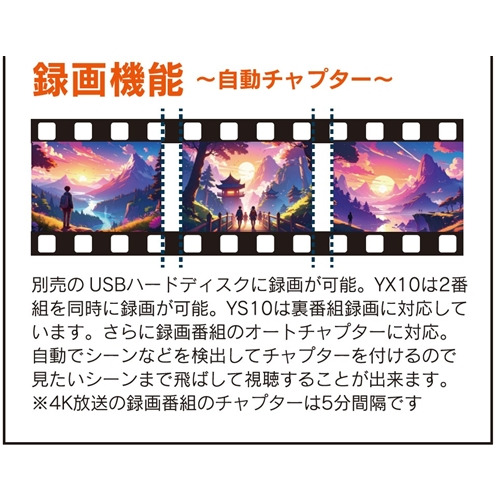 見たい番組が同時に放送していてもリアルタイムで同時に見逃さずに視聴することができる二画面表示機能を搭載。またUSBハードディスク(別売)に録画した番組の自動チャプター機能を搭載。自動でチャプターをつけるので見たいシーンまで飛ばして視聴することが出来ます。