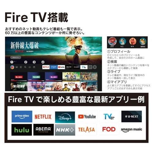 ・【世界で最も人気のストリーミングメディアプレーヤーシリーズFire TV搭載】Fire TV Stickは、全世界で累計販売台数2億台の世界で最も人気のストリーミングメディアプレイヤーシリーズ(単品、テレビ内蔵含む)です。その使い勝手をFire TV Stickなしで、そのまま使えるのがFire TV搭載スマートテレビです。(※Fire TVシリーズの2022年10月〜2023年9月の世界販売/出荷台数に関する外部調査機関による調査結果、および内部データによる)・【ネット動画もテレビ番組も一覧表示】おすすめのネット動画から放送中のテレビ番組まで一覧で表示できるので、観たいコンテンツを1つの画面で直感的に、すぐに見つけることができます。・【サクサク快適・直感的な操作感】サクサク動くので、コンテンツ検索時にストレスを感じることはほとんどありません。・【豊富なエンターテイメント】お気に入りのコンテンツが勢ぞろい ― 60万以上(※)の豊富な映画作品やTV番組のエピソードを心ゆくまで楽しもう。YouTube、TVerはもちろん、Prime Video、Netflix、ディズニープラス、U-NEXTなどのお気に入りのコンテンツ、HuluやDAZNなどの24時間ライブチャンネルやスポーツも配信やサブスクリプションで見られます。・【音声認識Alexa搭載】リモコンの音声認識ボタンを押しながらAlexaに話しかけて、観たいコンテンツを音声検索。一度に様々なストリーミングサービスのコンテンツを検索できます。(※Fire TVのサービスや一部機能のご利用にはAmazonアカウントでのサインインが必要です。)