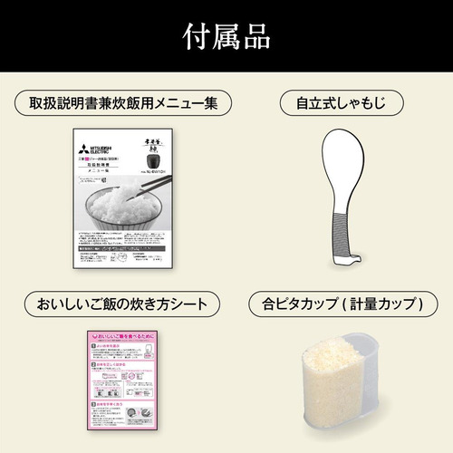 付属品:自立しゃもじ・合ピタカップ(計量カップ)・取扱説明書兼炊飯用メニュー集・おいしいご飯の炊き方シート