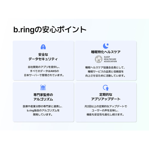 b.ring(ブリング)は着けているだけで生体情報を分析し健康をサポートするスマートリングです。日常生活に最適な着け心地とスタイリッシュなデザインが特徴です。