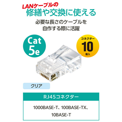 ●Cat5e用のRJ45コネクター10個入りです。単線・ヨリ線の両方に対応しているので、手持ちの材料を有効活用して必要な長さのケーブルを自作する際に活躍します。