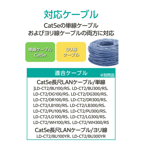 ●適合ケーブルは、[Cat5e長尺LANケーブル/単線]LD-CT2/BU100/RS、LD-CT2/BU300/RS、LD-CT2/DG100/RS、LD-CT2/DG300/RS、LD-CT2/DR100/RS、LD-CT2/DR300/RS、LD-CT2/LB100/RS、LD-CT2/LB300/RS、LD-CT2/PU100/RS、LD-CT2/PU300/RS、LD-CT2/LG100/RS、LD-CT2/LG300/RS、LD-CT2/WH100/RS、LD-CT2/WH300/RS、[Cat5e長尺LANケーブル/ヨリ線]LD-CT2/BU100YR、LD-CT2/BU300YRです。 ※別売品