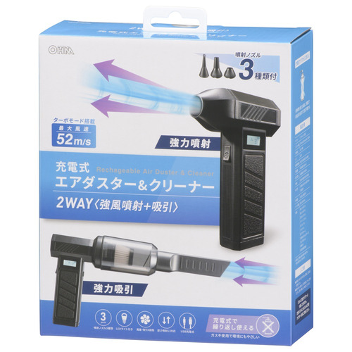 オーム電機 OA-MAD02CK 充電式エアダスター&クリーナー 強風噴射と強力吸引 ターボモード搭載 ブラック