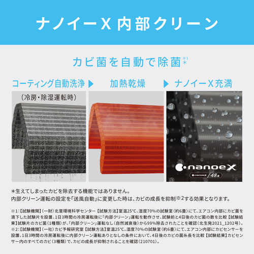 清潔機能:抗ウイルスエアフィルター(抗ウィルス/抗菌SIAA認証)、フィルターお掃除ロボット(BOX)、熱交換器(親水コート/ホコリレスコーティング)、防汚防カビコーティングファン、ナノイーX内部クリーン、おでかけクリーン、においケア、ナノイー防臭