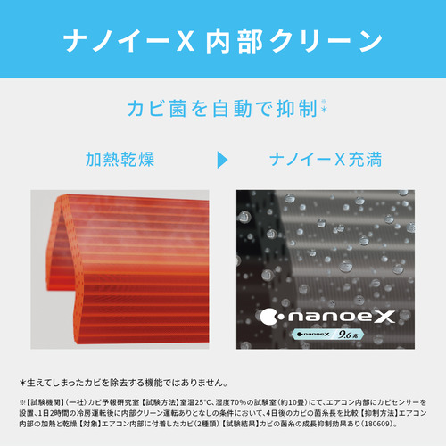 ・ナノイーXを生かしてお部屋の有害物質を抑制(※約8畳試験空間での<カビ菌>約2時間後の抑制効果。約6畳試験空間での<花粉>約3時間後、<ニオイ>約15分後、<PM2.5>約12時間後、<アレル物質>約6時間後の抑制効果。約6畳密閉試験空間での<浮遊菌>約4時間後<付着菌>約8時間後、<浮遊ウイルス>約3.5時間後<付着ウイルス>約2時間後の抑制効果です。数値は実際の使用空間での試験結果ではありません。脱臭効果は、周囲環境(温度・湿度)、運転時間、臭気、繊維の種類によって異なります。※) ・ナノイーX内部クリーン運転で内部のカビ抑制(※【試験機関】(一社)カビ予報研究室【試験方法】室温25度、湿度70%の試験室(約10畳)にて、エアコン内部にカビセンサーを設置、1日2時間の冷房運転後に内部クリーン運転ありとなしの条件において、4日後のカビの成長を比較【試験結果】カビセンサー内のカビ(2種類)の成長が抑制されることを確認(180609)。※)