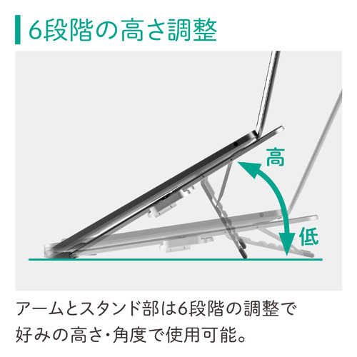 アームとスタンド部は6段階の角度調整が可能です。好みの高さ・角度で使用できるので、正しい姿勢を保つことができ、長時間のデスクワーク時も快適に使用することができます。アーム部分にはバネが入っているため、角度調整時に脚がグラつきにくく、安定した状態で角度調整できます。