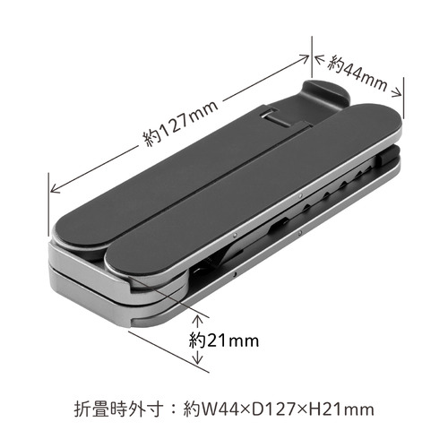 折りたたむと手のひらサイズでスマートフォンとほぼ同じサイズの超コンパクトなノートパソコンスタンドです。質量も約190gと軽量なので自宅からオフィスへの持ち運びや、外出先など場所を選ばずさまざまなシーンで活躍します。持ち運びに便利な専用の収納ポーチ付きで、パソコンケースやカバンへの収納にお使いいただけます。