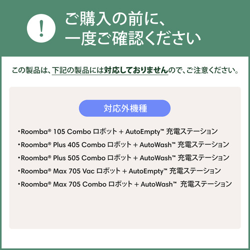 ●Roomba、Roomba Combo i、s、jおよびEssentialシリーズを含むクリーンベースまたはAutoEmpty 充電ステーション、Roomba Combo j9+ 用のクリーンベース自動ゴミ収集&給水充電ステーション、Roomba Combo 10 Max ロボット用のAutoWash 充電ステーション
