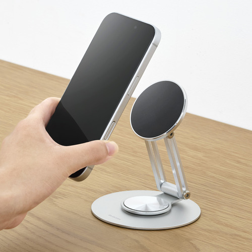●折り畳み式でコンパクトに持ち運べる!マグネットで簡単にスマートフォンの着脱ができる、MAGKEEPシリーズのスマホスタンドです。MagSafe非対応でも使用できるメタルプレート付き。マグネット部分は360度回転し、縦向き・横向きの切り替えもスムーズ。土台部分も回転するため、設置場所や使用シーンに合わせて自由に使えます。