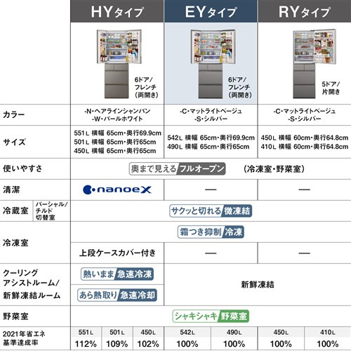 冷蔵室:・差替えドア棚 ・卵トレイ(卵収納量 12個) ・全棚ガラストレイ  ・わけられるん棚(3段目) ・パーシャル/チルド切替室(LED照明) ・パーシャル : オート急冷 ・天面照明 ・コントロールパネル : ドア側面 ・ドア開放アラーム大きめ ・ボトル棚 収納数ペットボトル1.5L×5本